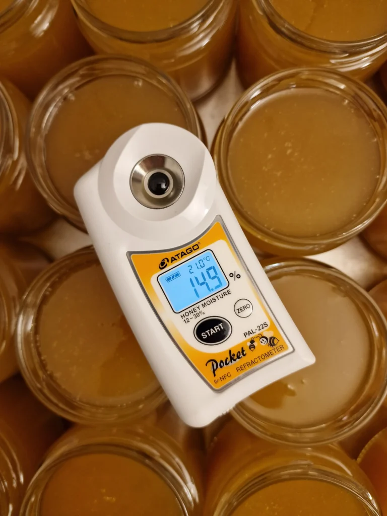 W naszej pasiece na etapie miodobrania sprawdzamy parametr którym jest zawartość wody w miodzie za pomocą wysokiej jakości refraktometru. Jeśli pomiar jest właściwy miód może spokojnie trafić do słoików, jeśli jednak parametr odbiega od normy zawartość wody należy niezwłocznie obniżyć osuszając miód za pomocą profesjonalnego urządzenia którym jest dehydrator. Jeśli Twój miód nie spełnia wymagań a nie chcesz go stracić mamy dla Ciebie dobrą wiadomość. Świadczymy usługę osuszania powierzonego nam miodu. Minimalny jednorazowy wsad wynosi 40 kg. Maksymalny jednorazowy wsad to 150 kg (110 l).